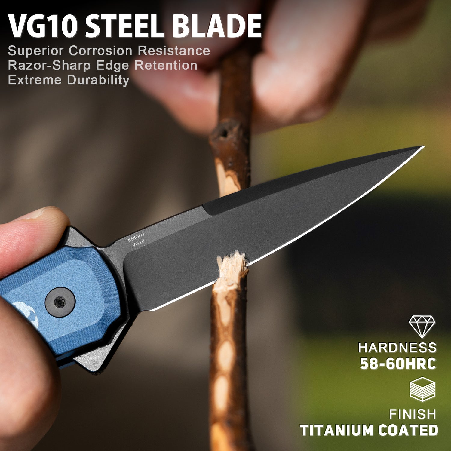 VG10 Super Sharp Blade – Rasiermesserscharfer Edelstahl mit ausgezeichneter Schnitthaltigkeit; schlankes 0,1-Zoll-Profil sorgt für ein ausgewogenes Verhältnis zwischen Präzision und Durchschlagskraft.