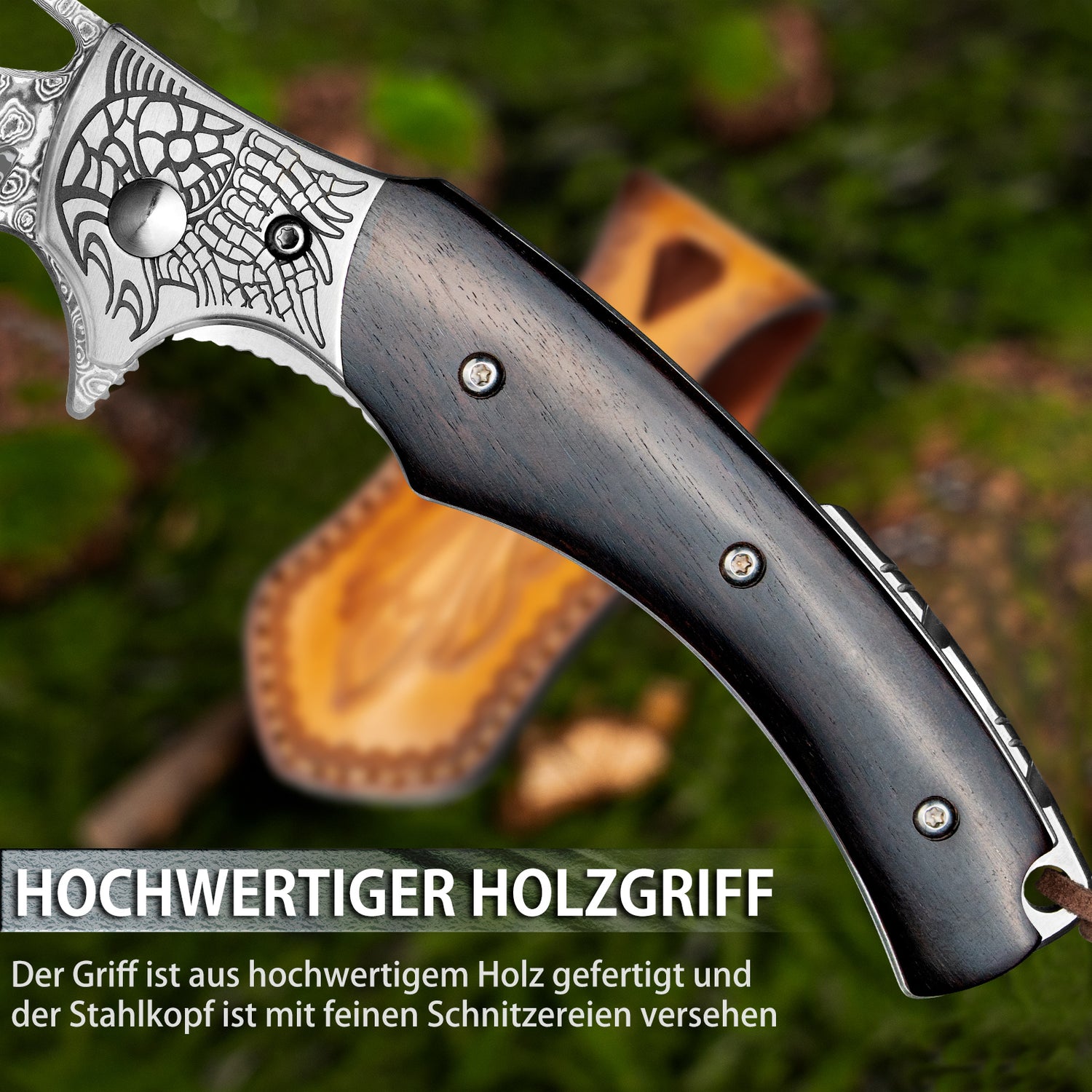 - 【SCHÖNER HOLZGRIFF】 Das handgefertigte Damast Taschenmesser von LOTHAR verfügt über einen ergonomisch geformten Ebenholzgriff, der leicht zu greifen ist. Der Griff ist aus Sandelholz gefertigt und hat einen schönen Glanz. Das geprägte Design auf der Oberseite des Griffs ist ebenfalls sehr kunstvoll und ästhetisch ansprechend. Das macht es zu einem besonderen Erlebnis.
