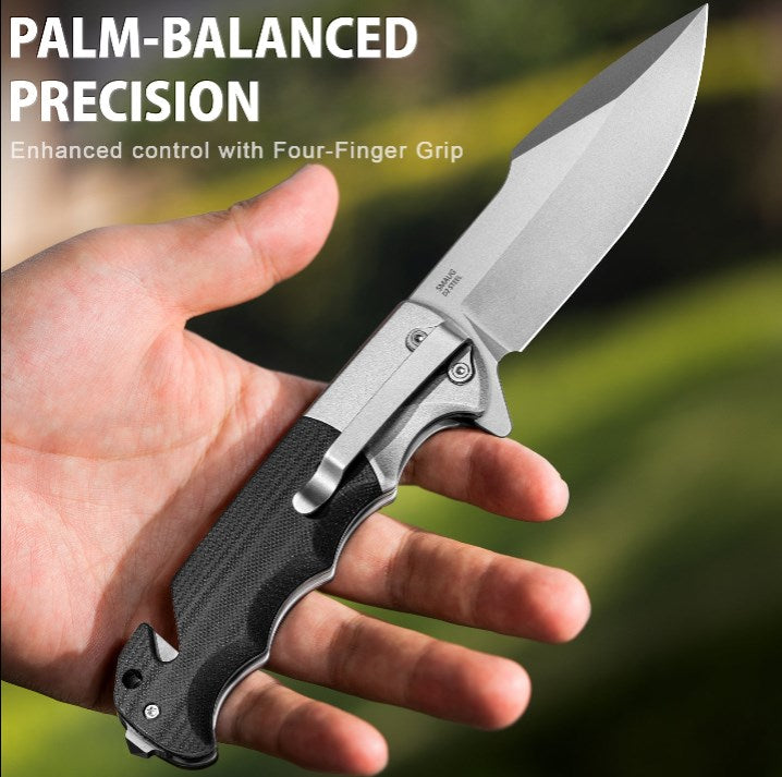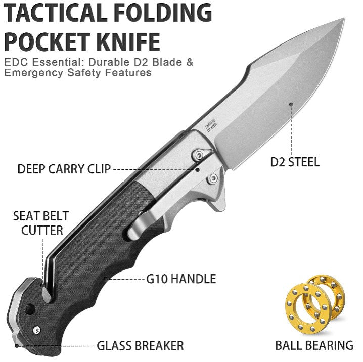 LOTHAR SMAUG Klappmesser Einhandmesser, 9.5 mm D2 Stahl Rettungsmesser mit G10 Griff, Taschenmesser mit Glasbrecher und Gurtschneider, Liner Lock, Überlebensmesser für Auto mit Clip