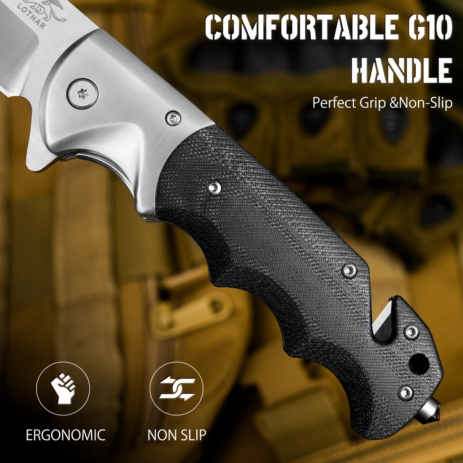 - MULTIFUNKTIONS SURVIVAL MESSER: LOTHAR Klappmesser ist ein 3-in-1-Multifunktionsmesser, bei dem sowohl ein Glasbrecher als auch ein Gürtelschneider in die Basis des Griffs integriert sind
