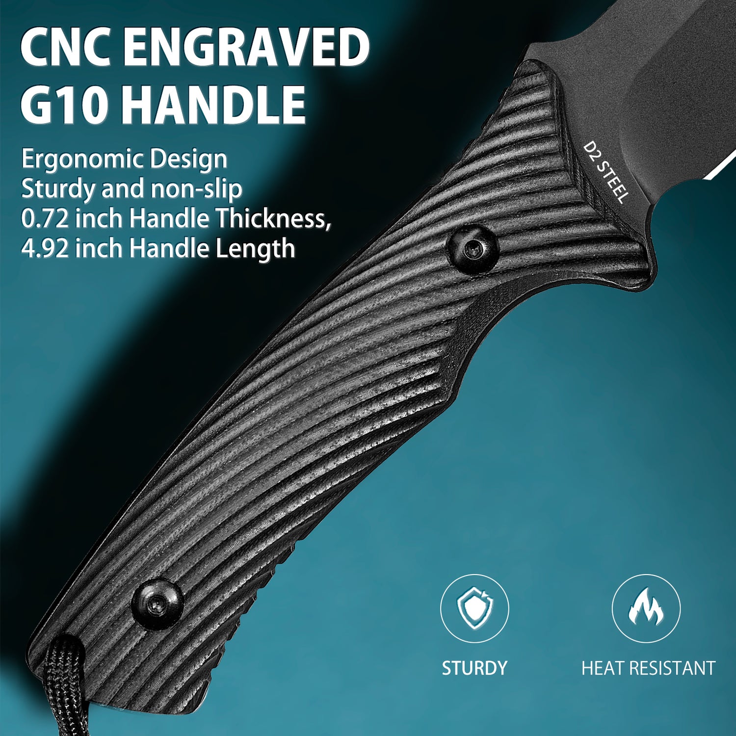 - LANGLEBIGE D2-KLINGE: „harter Stahl“ mit unglaublicher Schnitthaltigkeit, ausgezeichneter Härte und Korrosionsbeständigkeit. mit einem HRC von 62. Die Klinge ist zum Schutz vor Rost schwarz beschichtet und hat auch einen Stealth-Vorteil.