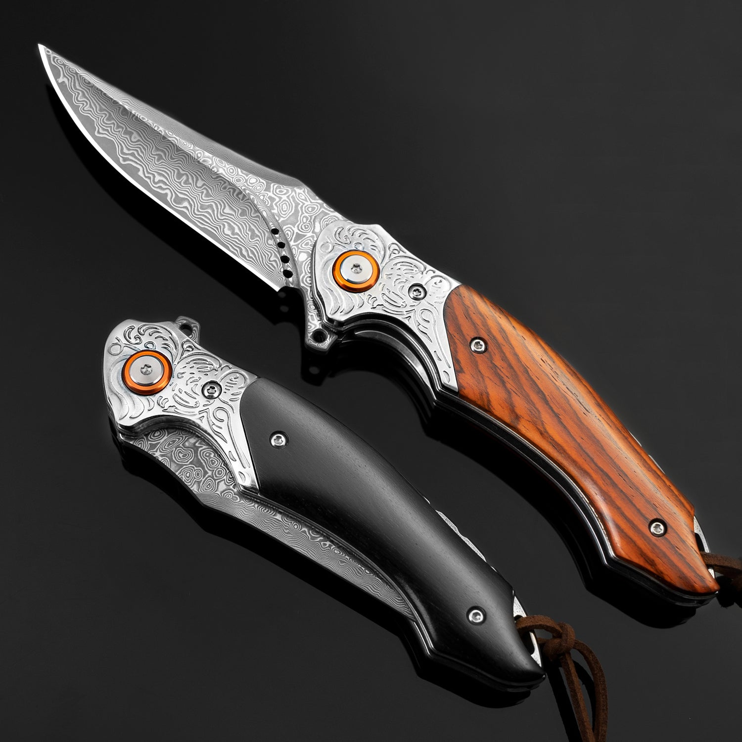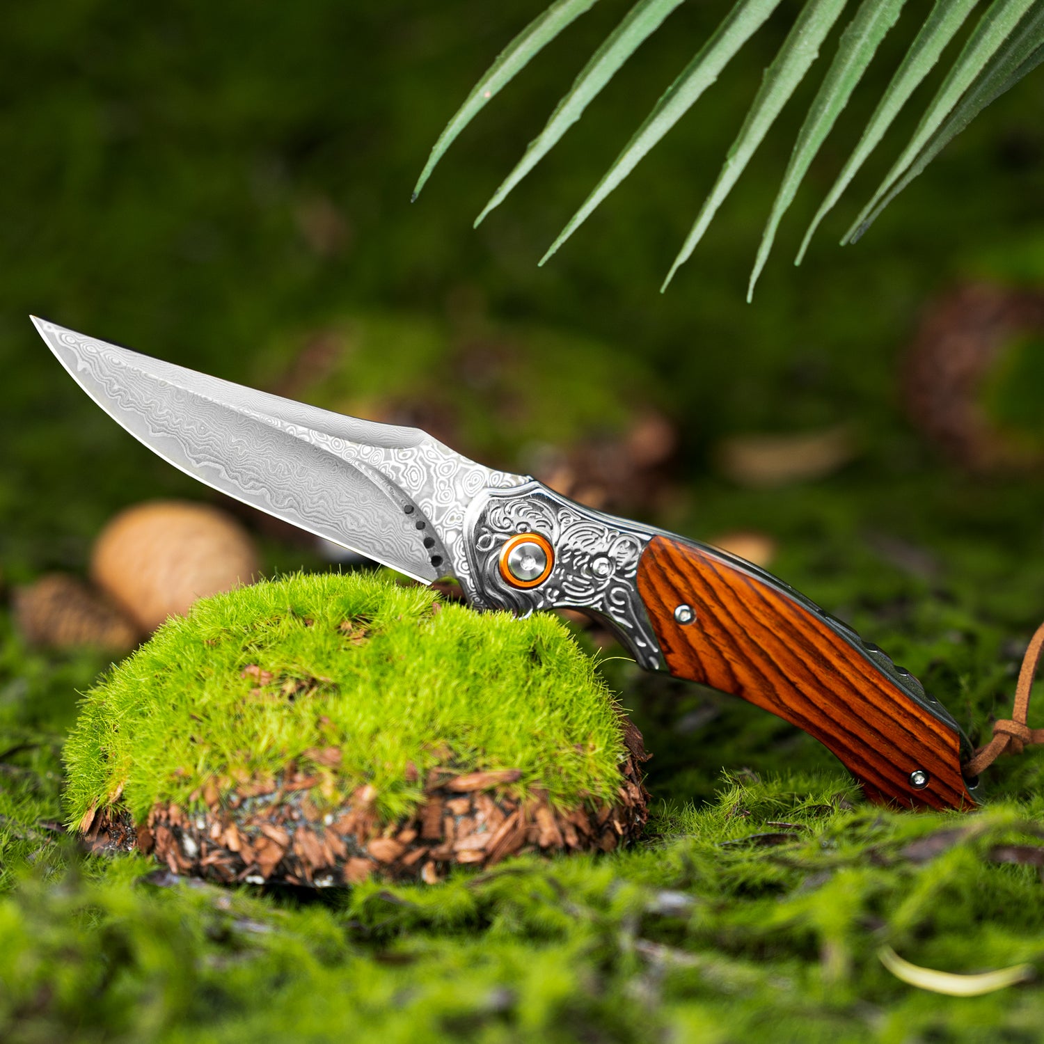 LOTHAR TUNA Damast Klappmesser, Damast Taschenmesser aus 67 Lagen VG10 Damaststahl, Einhandmesser mit Scharfe Klinge und Rosenholzgriff, Gürtelclip, für Sammlung oder Geschenk