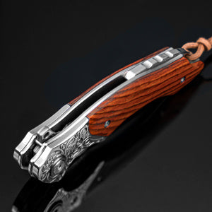 - HOCHWERTIGER ROSENHOLZGRIFF: Das handgefertigte Damast Taschenmesser von LOTHAR verfügt über einen ergonomisch geformten Holzgriff, der leicht zu greifen ist. Der Griff ist aus rotem Sandelholz gefertigt und hat einen schönen Glanz